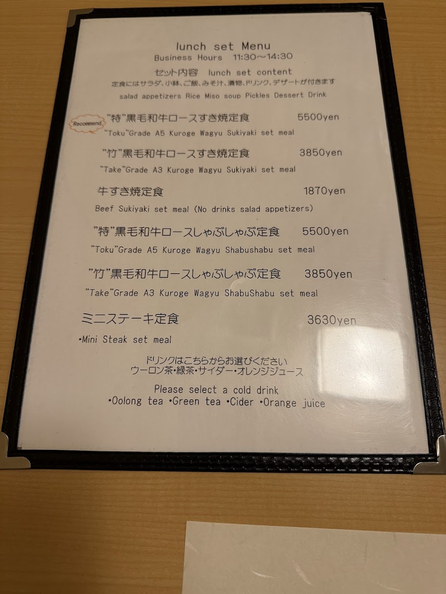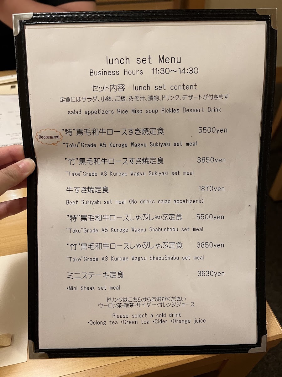 Guests can enjoy signature selections like tender Kuroge wagyu beef, served either in a flavorful sukiyaki broth or prepared shabu shabu style. Meals often come accompanied by seasonal vegetables, rice, and miso soup, creating a balanced and satisfying setting. Lighter dishes such as roasted beef, fresh salads, and grilled asparagus provide additional variety, while dessert options like refreshing kiwi sherbet offer a subtle sweetness to conclude the meal.